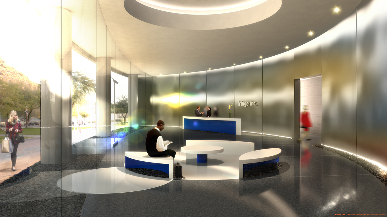 The Kitchen Sink Studios team used an outstanding design by DAVIS Architects and an existing computer model (above) to create four compelling renderings to be used for direct marketing and pre-leasing of the new tower. Some significant revisions to the design of the building and lobby (including raising the ceiling by four feet) were accomplished on the fly, making the project a bit more challenging.
